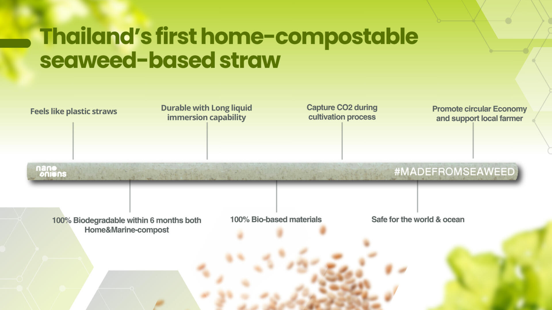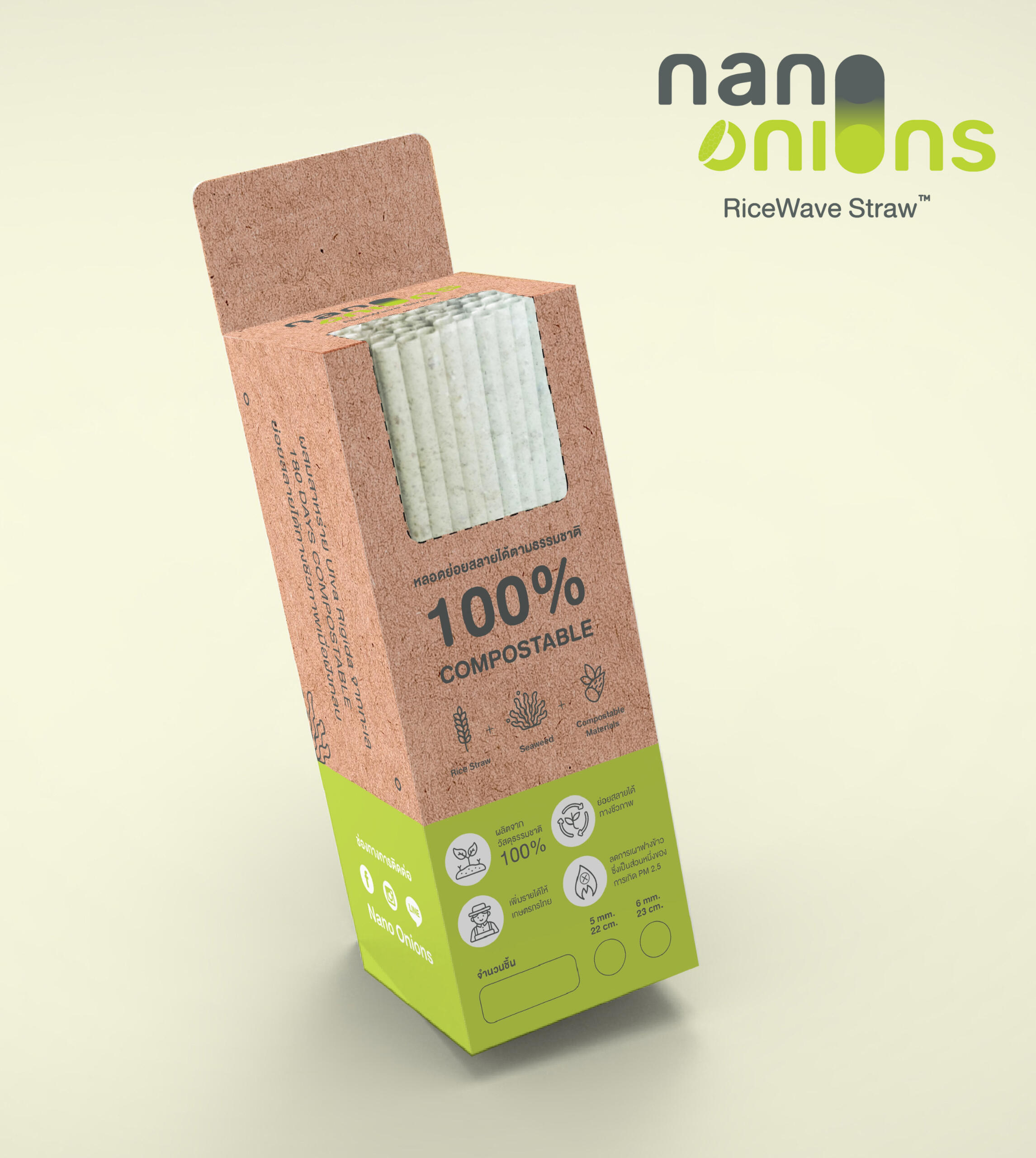 Thailand’s First Seaweed-Based Biomaterial InnovatorNano Onions is reimagining single-use plastics with sustainable, marine-safe alternatives. Our flagship product, RiceWave Seaweed Straw, is compostable at home and at sea — engineered to disappear.Sip the future, Save the world